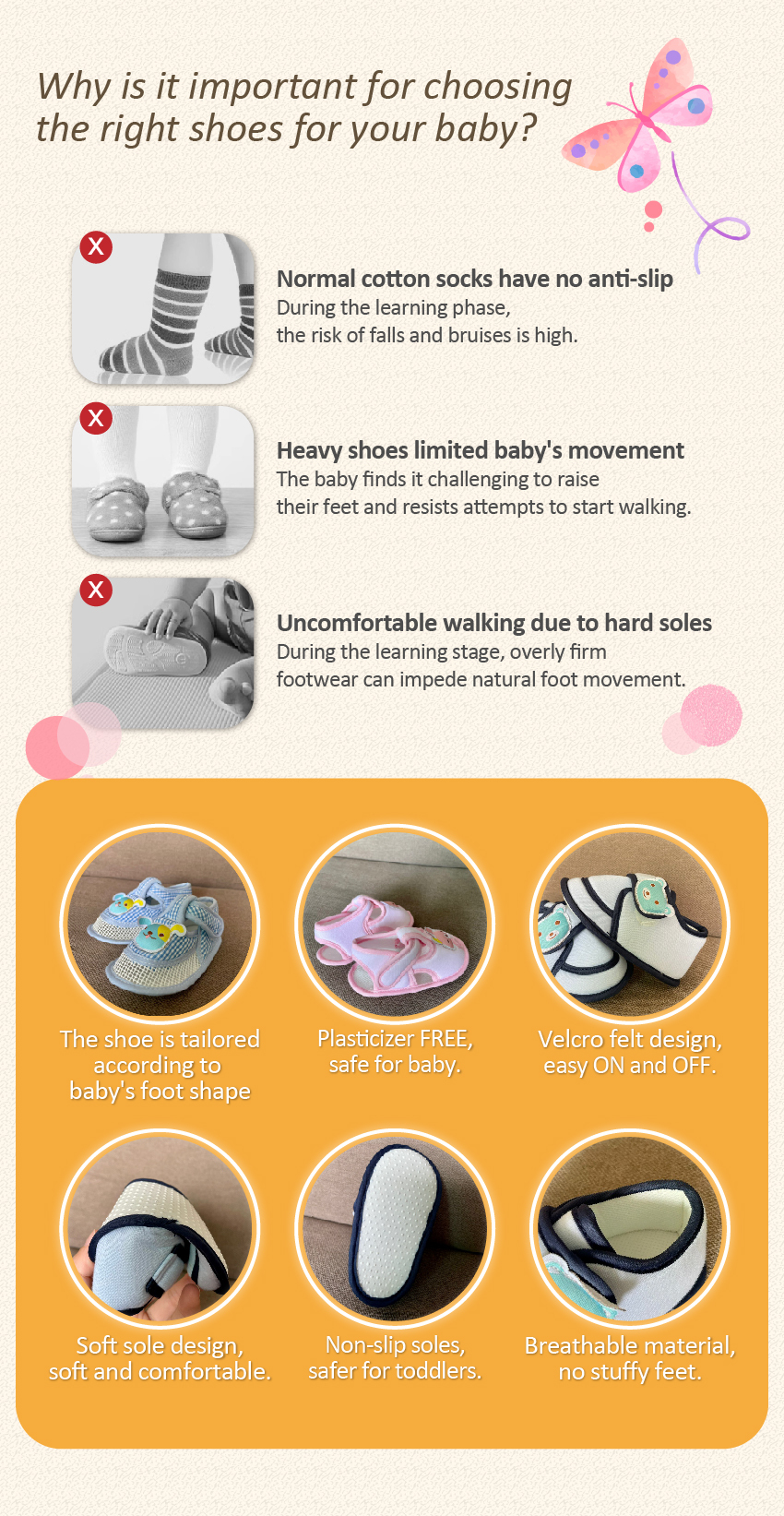 - The shoe is tailored according to baby's foot shape